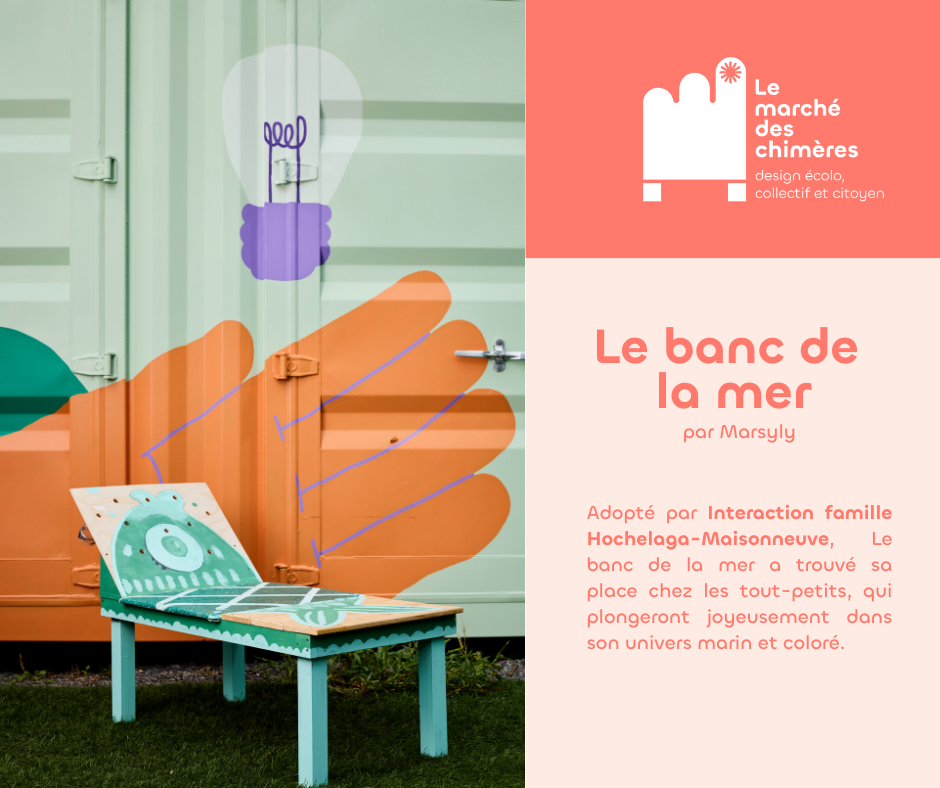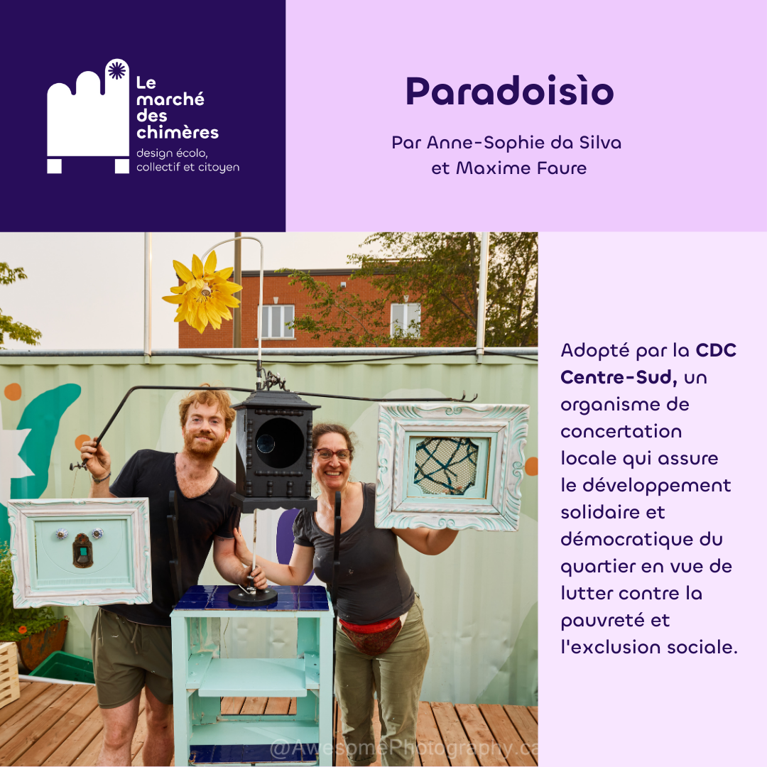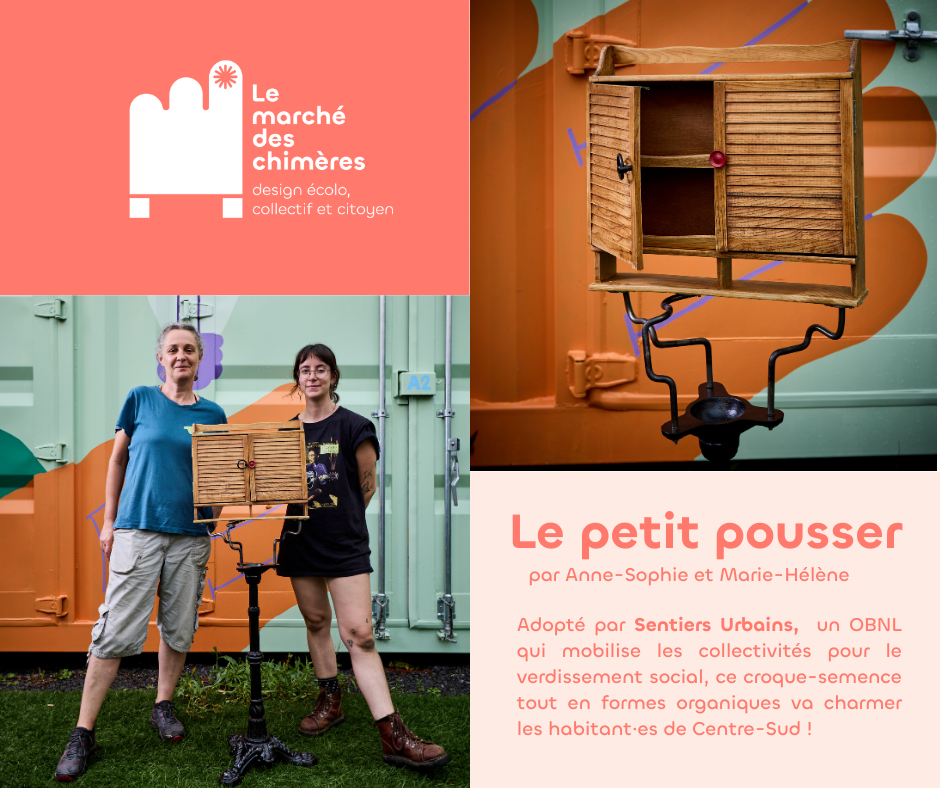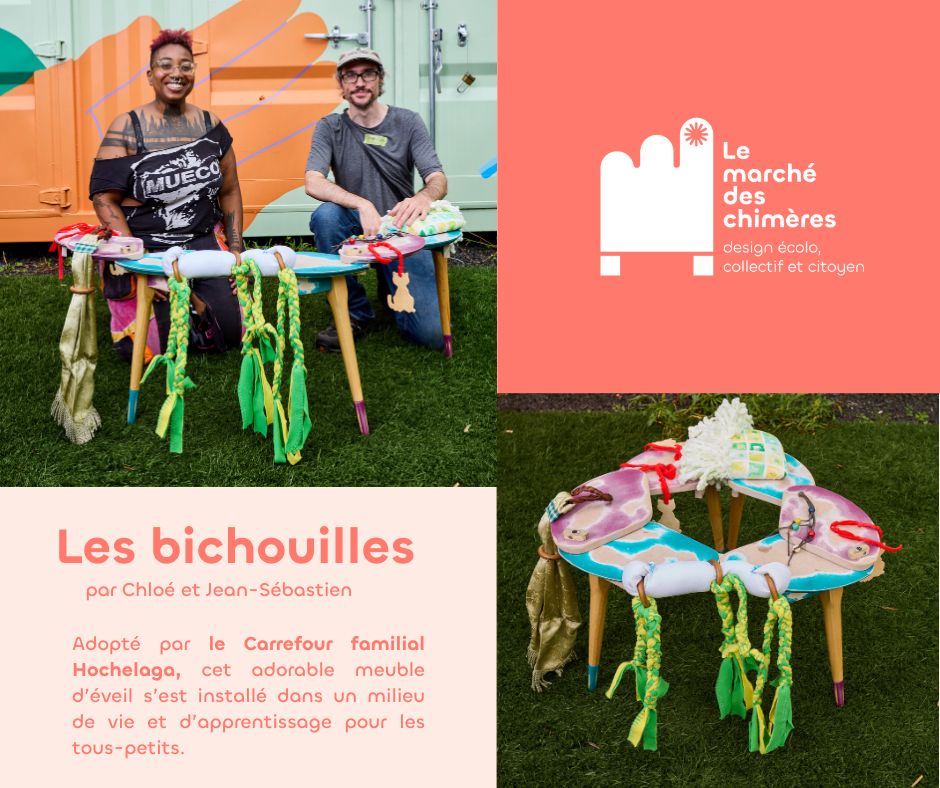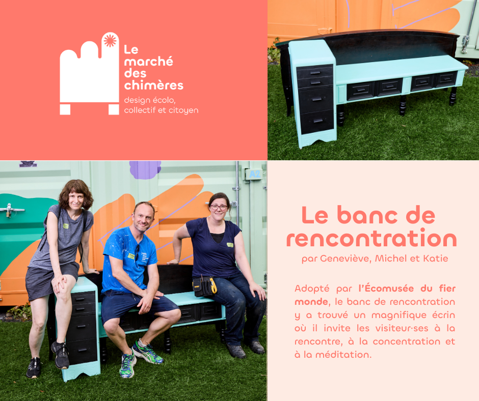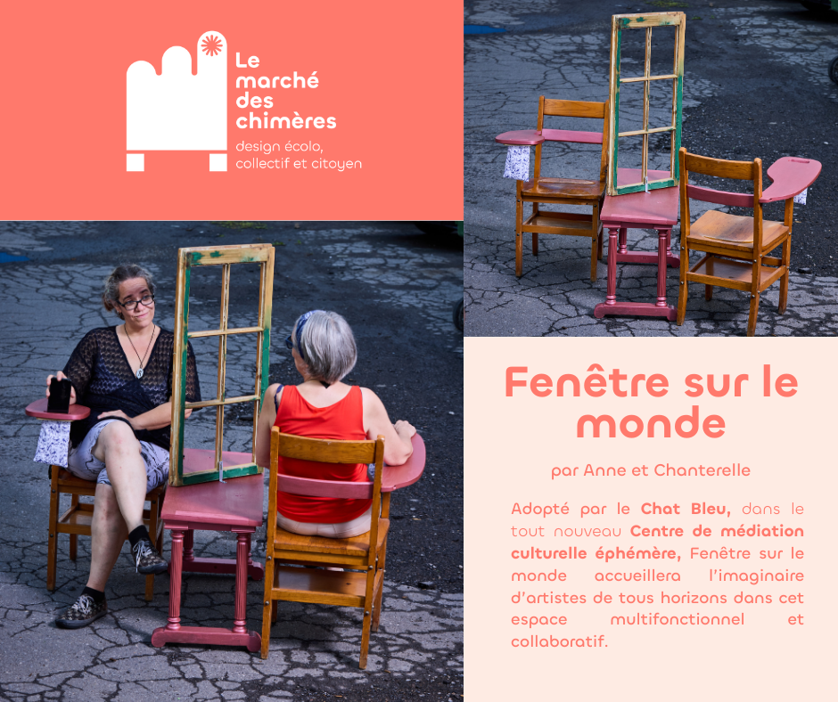 Le marché des chimères est un projet artistique et social qui invite les citoyen·nes à revaloriser des objets de seconde main destinés à être jetés pour créer des meubles hybrides à partir de matériaux usagés. Le marché des chimères est porté par la compagnie de création Les précieuses fissures (direction artistique) en collaboration avec LESPACEMAKER (là où ont lieu les ateliers de création), Écoscéno (avec son expertise de l’écoconception). Les éditions 2024 et 2025 ont eu lieu dans le quartier Centre-Sud.