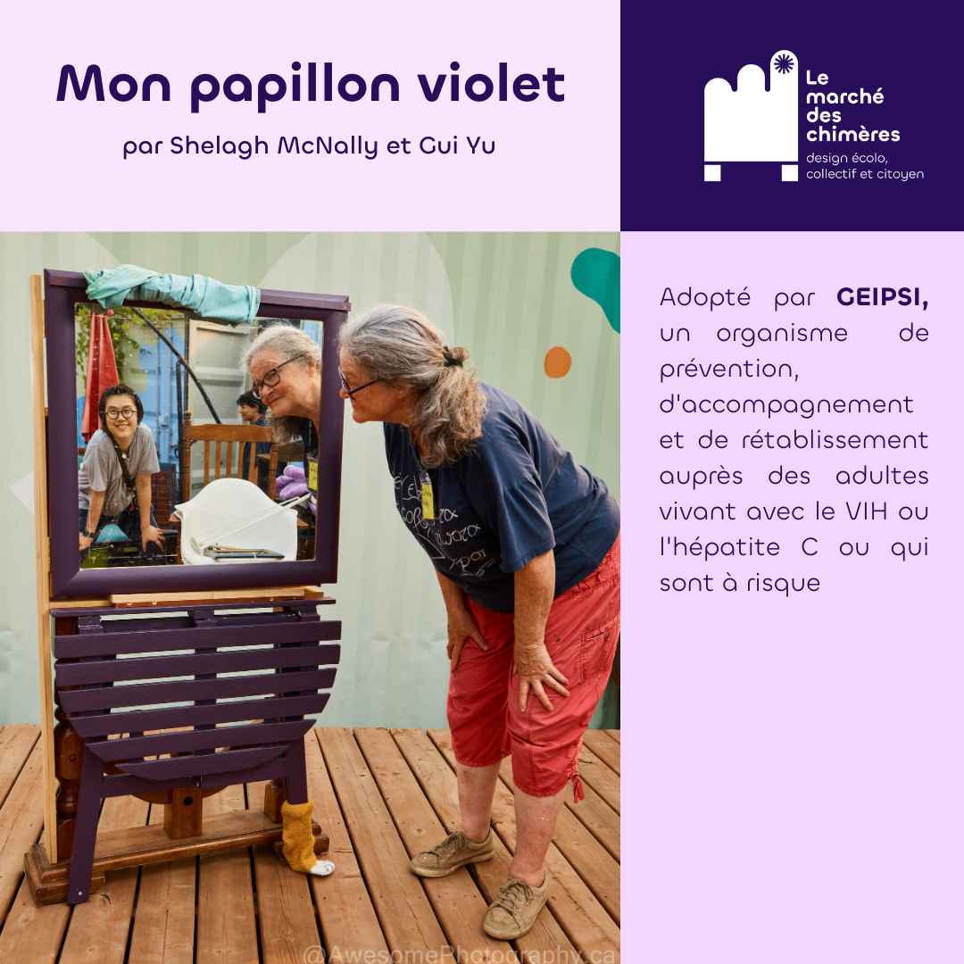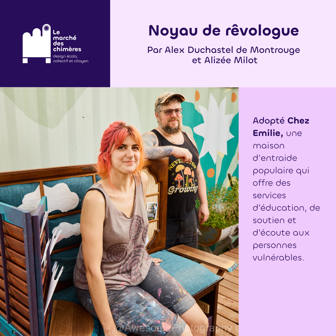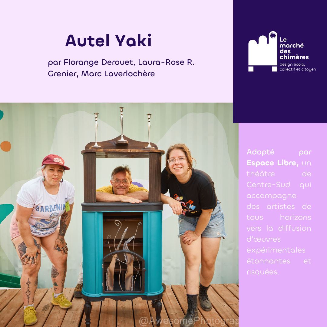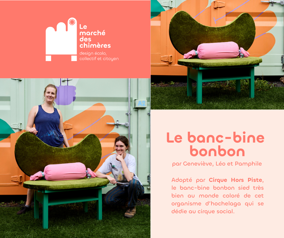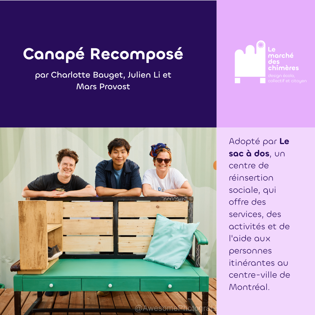 Le marché des chimères est un projet artistique et social qui invite les citoyen·nes à revaloriser des objets de seconde main destinés à être jetés pour créer des meubles hybrides à partir de matériaux usagés. Le marché des chimères est porté par la compagnie de création Les précieuses fissures (direction artistique) en collaboration avec LESPACEMAKER (là où ont lieu les ateliers de création), Écoscéno (avec son expertise de l’écoconception). Les éditions 2024 et 2025 ont eu lieu dans le quartier Centre-Sud.